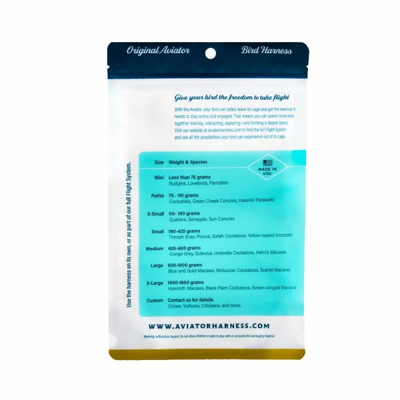 Le harnais Aviator est un harnais sûr et léger qui vous permet d'emmener votre oiseau dehors en toute sécurité, sans crainte.
