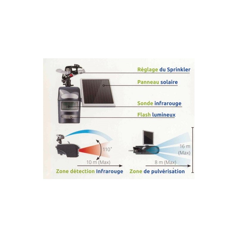 Dès l’approche d’un intrus, un puissant jet d’eau se déclenchera pour le mettre en fuite.